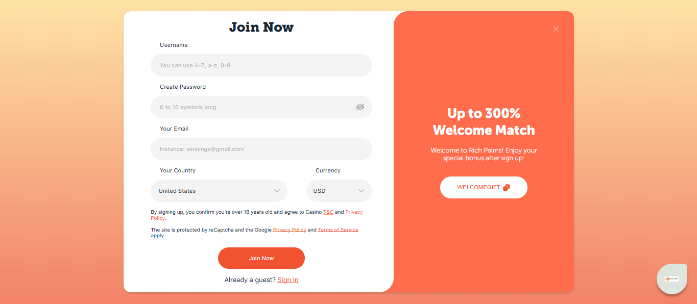 At Rich Palms Casino, signing up and logging in is as easy as 1-2-3. With just a few clicks, players can create an account and start enjoying all the exciting games and bonuses that the casino has to offer. The user-friendly interface makes the process effortless, allowing players to focus on their gaming experience rather than dealing with complicated registration procedures. Whether you’re a seasoned player or a newcomer to online casinos, Rich Palms Casino ensures a seamless and hassle-free sign-up and login process. Join now and start winning big at Rich Palms Casino!